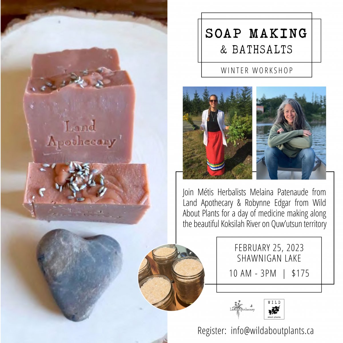 Join Land Apothecary and Wild About Plants for a winter workshop on beautiful Quw’utsun territory (in Shawnigan Lake). Participants will learn how to make cold process soap through a fun and interactive demonstration session & soothing bath salts for tired sore muscles. Supplies will include high quality ingredients & essential oils as well as wildcrafted plants! Teachings will be shared on materials and plants used during the soap making process and the therapeutic benefits of bath salts!
